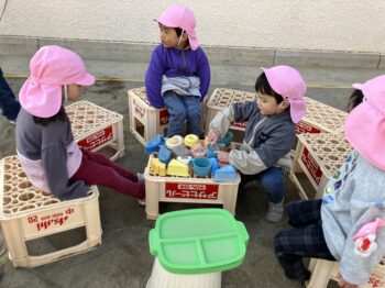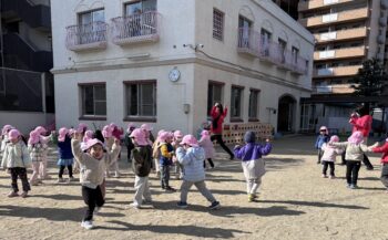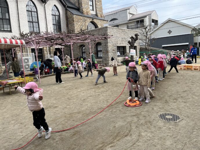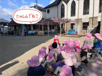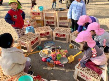 寒い日も 園庭には楽しいドラマがたくさんあります。