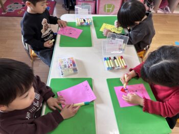 大好きなお友だちの顔や先生の顔を思いながら、「〇〇ちゃんとあそんだところ!また、あそびたいな」等、様々な気持ちを膨らませながら思いのこもったハガキを描きます。みんな自然とにっこりに。