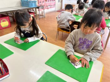 年賀状で午の塗り絵を色ぬりした事を思い出しながら、「いまは、うまどし!」「わたしはうさぎにする!」等と好きな干支を選んで、はみ出さないように… と丁寧に塗る姿がありました。