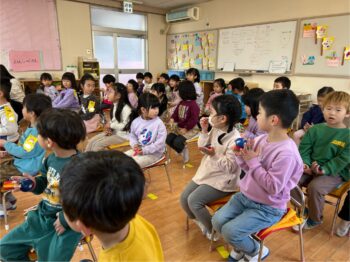 カスタネット、すず、タンバリン、トライアングルを使ってリズム打ち。