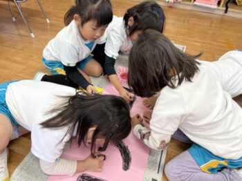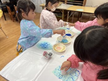 太陽と雨粒のスタンピングでガーランドを作り!晴れっぽい色や雨っぽい色を見つけてカラフルに☀️💧