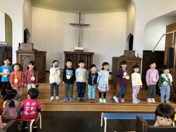 いつも神様に愛され守られて大きくなってきたまんなかぐみさんたち。礼拝堂で幼児祝福礼拝を守りました。