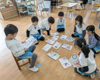 かるたにも、「ことわざかるた」、「マーク(標識)かるた」、「聖話かるた」などいろんな種類のかるたで遊んだみんな。そこで、「たけなか幼稚園かるた」を作ってみることに!
