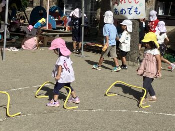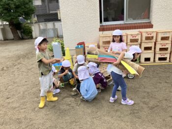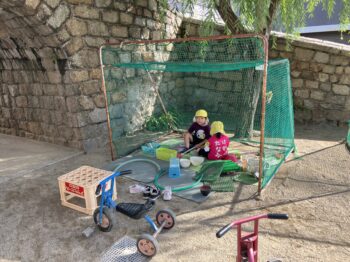 園庭にあるおもちゃ?を、自分で(自分たちで)いろんなものに見立てて遊ぶ姿