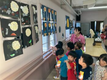 ホールには、和紙を使った染め紙・タンポを使ってぽんぽん・大きいくみは「コンテ」を使って。