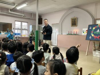 礼拝の中で林先生から、天使がマリアさんに「あなたは神様の赤ちゃんの お母さんになります。」とお知らせがあったお話を聞きました。