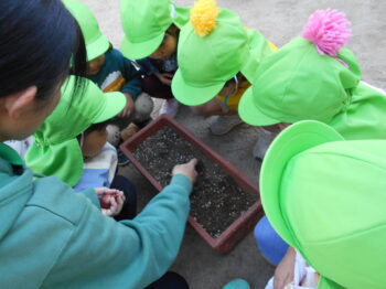 寒くならないように、大きくなるように暖かい土のお布団をみんなでかけてあげます。