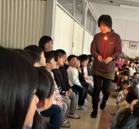 ロウソクの先の赤い炎をじっと見つめる子どもたち。