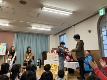 園長先生からお誕生日絵本とキャンディーレイのプレゼント。