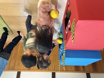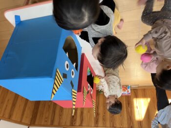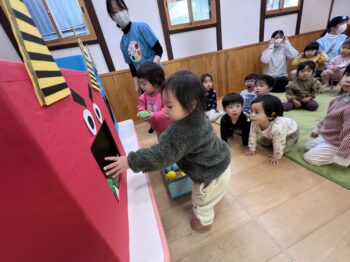 会の最後には、鬼さんのお口にお豆(カラーボール)を「どーぞ」「ぱく!」