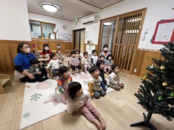 みんなで集まって、赤ちゃんイエス様がお生まれになった日(クリスマス)のお話を聞き、
