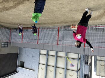 「ねえねえ。あがってる〜?」後ろを確認しながら、友だちともぶつからないように気をつけて。